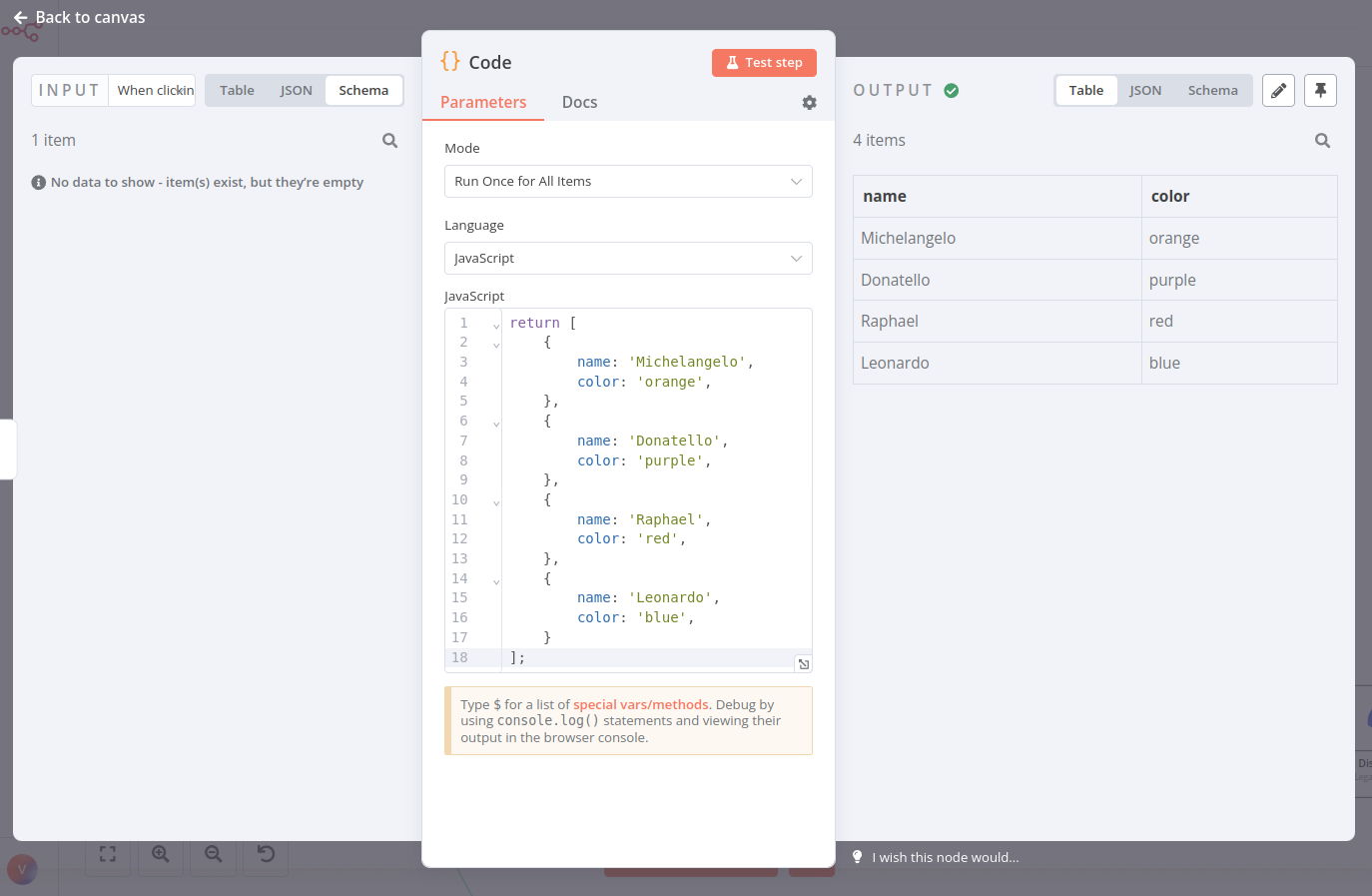 ¥For example, the array of objects representing the Ninja turtles would look like this in the Code node:
