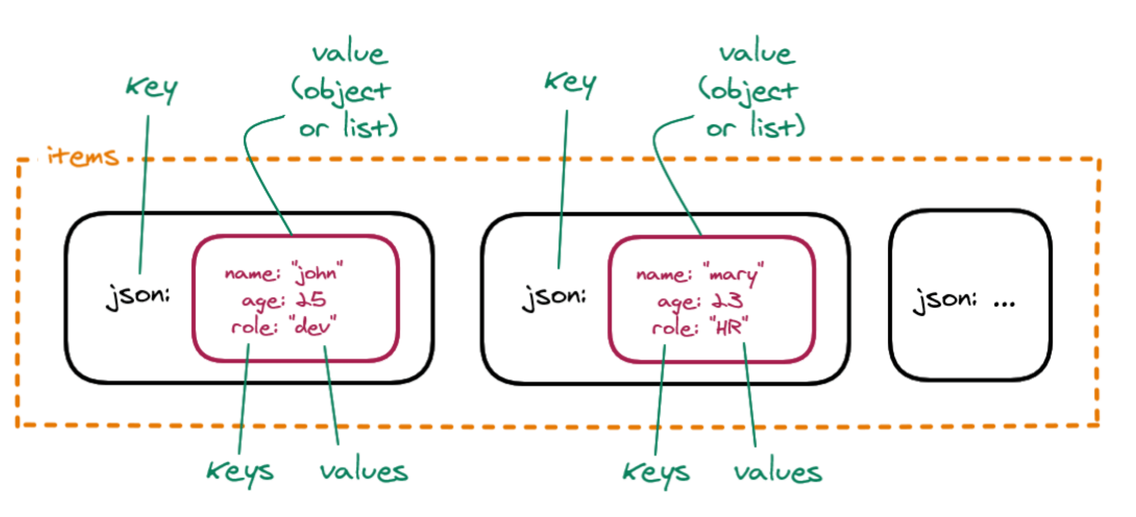 ¥Data sent from one node to another is sent as an array of JSON objects. The elements in this collection are called items.